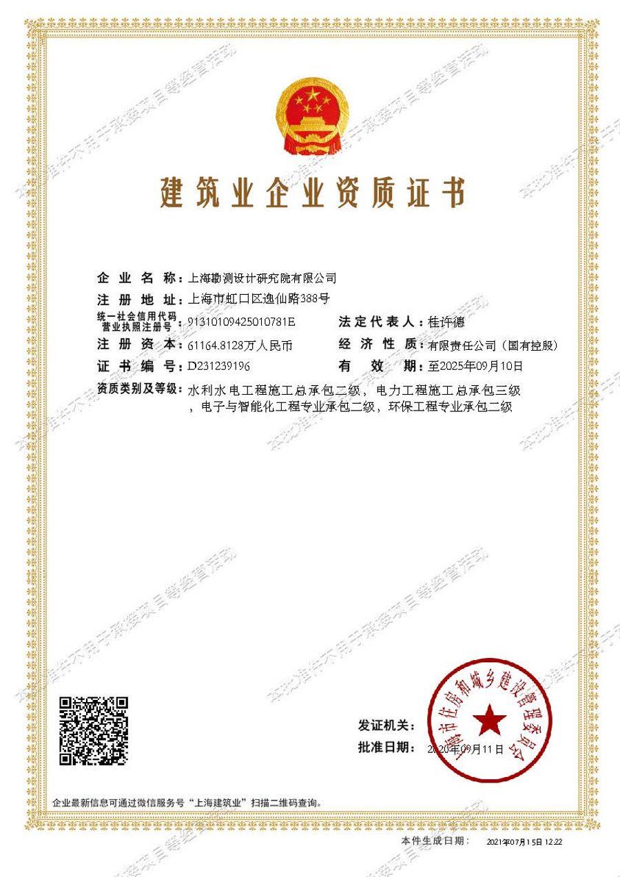 水利水電工程施工總承包二級資質,電力工程施工總承包三級,電子與智能化工程專業承包二級,環保工程專業承包二級